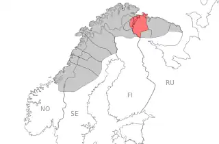 Skolt Sámi (sääʹmǩiõll [ɕa̟ːmʰc͡çjɘhlː], "the Sámi language", or nuõrttsääʹmǩiõll [nwɘrʰtːɕa̟ːmʰc͡çjɘhlː], "the Eastern Sámi language", if a distinction needs to be made between it and the other Sámi languages) is a Uralic, Sámi language that is spoken by the Skolts, with approximately 300[2] speakers in Finland, mainly in Sevettijärvi and approximately 20–30 speakers of the Njuõʹttjäuʹrr (Notozero) dialect[3] in an area surrounding Lake Lovozero in Russia. In Norway, there are fewer than 15 that can speak Skolt Sámi (as of 2023);[4] furthermore, the language is[4] largely spoken in the Neiden area.[3] It is written using a modified Roman orthography which was made official in 1973.