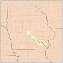The Skunk River rises in two branches, the South Skunk (185 miles (298 km) long) and the North Skunk (129 miles (208 km) long).[3] The headwaters of the South Skunk are in Hamilton County in north central Iowa. It flows roughly due southward, to the west of Interstate 35, and passes through the city of Ames, before turning southeasterly. In Keokuk County, it is joined by the North Skunk, which has its headwaters in Marshall County. It then proceeds southeastward and flows into the Mississippi about five miles south of the city of Burlington.