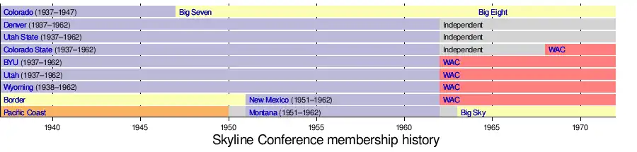 The conference became known as the Skyline Eight after New Mexico and Montana joined in 1951.[5] The conference officially dissolved as of July 1, 1962, after four of its members (BYU, New Mexico, Utah, and Wyoming) departed to form the Western Athletic Conference (WAC).[6] Montana operated as an independent for one football season in 1962 until the formation of the Big Sky Conference in 1963. Colorado State became independent until it joined the WAC in 1968. Utah State operated as an independent for fifteen seasons, until it joined the Pacific Coast Athletic Association (later named the Big West Conference) in 1977.