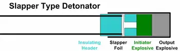 A slapper detonator, also called exploding foil initiator (EFI), is a detonator developed by Lawrence Livermore National Laboratory, US Patent No. 4,788,913 (Filed 1971, Granted 1988). It is an improvement over the earlier exploding-bridgewire detonator. Instead of directly coupling the shock wave from the exploding wire (as the bridgewire does), the expanding plasma from an explosion of a metal foil drives another thin plastic or metal foil called a "flyer" or a "slapper" across a gap, and its high-velocity impact on an explosive (for example, PETN or hexanitrostilbene) then delivers the energy and shock needed to initiate a detonation. Normally all the slapper's kinetic energy is supplied by the heating (and hence expansion) of the plasma (the former foil) by the current passing through it, though constructions with a "back strap" to further drive the plasma forward by magnetic field also exist. This assembly is quite efficient; up to 30% of the electrical energy can be converted to the slapper's kinetic energy. The device's name is derived from the English word 'slap'.