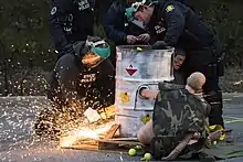 It is sometimes impossible for officers to know what is inside the sleeping dragon without cutting into it.[1] Officers may cut into the pipe with such tools as an angle grinder, rotary saw, or whizzer saw, followed by a pry bar and pliers; or in the case of concrete, chipping hammers, hammer drills, and breakers. Abrasive saws, a band saw, and an angle grinder may be used on steel pipes.[2] Officers may put fire retardant hoods and earmuffs on the protesters to protect them from sparks and noise as tools are used to cut through the sleeping dragon.[3]