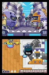 When the second game was localized for the American audience, there was concern about the slime's identifiability with the public, and so Dragon Quest was added to the title.[4] Watabe wanted to make sure that Rocket Slime used both screens for gameplay, unlike most other DS titles that just used it for menus, believing that the duel screens was the consoles "focus".[4][6] Early in the title's life, the developers had a version of it that uses the touch screen to use Rocket's Elasto Blast technique, but scrapped the idea, due to it being too hard to control.[6] In a search for what to do with the Nintendo DS's two screens, the developers arrived at the idea of a tank battle, and a duel view allowing players to see inside and outside the tank at once.[5] Each character name was approved during localization by Square Enix, and names involving American cultural references had to be explained in Japanese, a task that saw many jokes cut and replaced.[5]