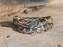 Slowinski's corn snake is medium-sized and colored grayish-brown, with a series of large, alternating, chocolate-brown blotches. These blotches are often bordered in black. It has a spearhead marking on the head. The belly is checkered black and white, giving it an appearance of maize (its close relative, the corn snake, is believed to have gotten its name for this belly pattern).[4]