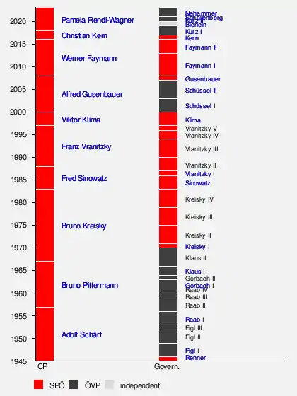 The chart below shows a timeline of the social-democratic chairpersons and the Chancellors of Austria since 1945. The left bar shows all the chairpersons (Bundesparteivorsitzende, abbreviated as CP) of the SPÖ, and the right bar shows the corresponding make-up of the Austrian government at that time. The red (SPÖ) and black (ÖVP) colours correspond to which party led the federal government (Bundesregierung, abbreviated as Govern.). The last names of the respective chancellors are shown, with the Roman numeral standing for the cabinets.