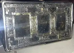 Two of the panels around the sides are lost. The two remaining side-panels contain interlace, and signatures and other Latin inscriptions around their borders.[6] Both of the short (or end) sides have triangular bronze mounts that would have functioned as clasps so that the shrine could be carried.[3][24] Both have half-length decorative panels to hold inserts of ecclesiasticals. One is lost but the one that remains contains a figure, generally assumed to be St. Molaisse, in full profile wearing a tunic or habit.[15] He has rounded facial features, a disproportionally large head,[25] and a forked beard. He holds a book, probably his Gospel, to his chest with one hand and a pastoral staff, a flail or a sprinkler for holy water with the other.[6][26] His outer vestment, or chasuble, was originally embroidered by palm-leaf designs, while the collar is cut in sharply pointed V-shapes.[lower-alpha 2][28]
