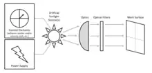 A solar simulator (also artificial sun or sunlight simulator) is a device that provides illumination approximating natural sunlight. The purpose of the solar simulator is to provide a controllable indoor test facility under laboratory conditions. It can be used for the testing of any processes or materials that are photosensitive, including solar cells,[1] sun screen,[2] cosmetics,[3] plastics, aerospace materials,[4] skin cancer,[5] bioluminescence,[6] photosynthesis,[7] water treatment,[8] crude-oil degradation,[9] and free radical formation.[10] Solar simulators are used in a wide range of research areas including photobiology,[11] photo-oxidation,[12] photodegradation,[13] photovoltaics,[14] and photocatalysis.[15]