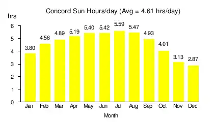 Solar power in New Hampshire provides a small percentage of the state's electricity. State renewable requirements and declining prices have led to some installations. Photovoltaics on rooftops can provide 53.4% of all electricity used in New Hampshire, from 5,300 MW of solar panels, and 72% of the electricity used in Concord, New Hampshire.[2] A 2016 estimate suggests that a typical 5 kW system costing $25,000 before credits and utility savings will pay for itself in 9 years, and generate a profit of $34,196 over the rest of its 25-year life. A loan or lease provides a net savings each year, including the first year.[3] New Hampshire has a rebate program which pays $0.75/W for residential systems up to 5 kW, for up to 50% of the system cost, up to $3,750.[4] However, New Hampshire's solar installation lagged behind nearby states such as Vermont and New York, which in 2013 had 10 times and 25 times more solar, respectively.
