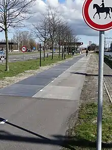 In April 2017 the first heated solar cycle path was installed in the Bovenbuurtweg in Ede. The panels would stay free of snow and ice during the winter.[27] In February 2020 the solar panels were replaced with panels with a different surface coating to make the cycle path less slippery.[28] However by 2021 the solar panels were gone and replaced by a surface made of bricks.