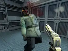 Soldier of Fortune is best known for its graphic depictions of firearms dismembering the human body. This graphic violence is the game's main stylistic attraction, much like the destructible environments of Red Faction or bullet time of Max Payne. The GHOUL engine enables depiction of extreme graphic violence, in which character models are based on body parts that can each independently sustain damage (gore zones). There are 26 zones in total: a shot to the head with a powerful gun will often make the target's head explode, leaving nothing but the bloody stump of the neck remaining; a close-range shot to the stomach with a shotgun will leave an enemy's bowels in a bloody mess, and a shot to the nether regions will cause the victims to clutch their groin in agony for a few seconds before kneeling over dead. It is possible to shoot off an enemy's limbs (head, arms, legs) leaving nothing left but a bloody torso. In the last mission there is also a fictional microwave weapon, causing the enemies to fry or explode, depending on the firing mode. However, nonviolence is a possibility, if the player is a good shot it is possible to shoot an enemy's weapon out of their hand, causing them to cower on the floor to surrender. The game also came with password-protected options to disable all gore and there is even a version of the game with the extreme violence permanently locked-out, titled Soldier of Fortune: Tactical Low-Violence Version.[7]