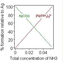 Formation of a chemical complex may also change solubility. A well-known example is the addition of a concentrated solution of ammonia to a suspension of silver chloride, in which dissolution is favoured by the formation of an ammine complex.