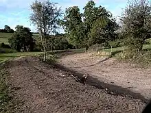 During excavations a drainage culvert was discovered about 20 m (22 yd) west of Terminus bridge.[31] Work resumed in September and November 2014 to batter and reshape the canal embankments. Excess topsoil was removed and the towpath reinstated on the stretch to the east from Terminus bridge for about 200 m (220 yd). On the same stretch a retaining wall was discovered in the south embankment continuing for about 100 m (110 yd), possibly built as a repair to a weak section of canal banking. Vertical infills of white clay have been used along this wall.