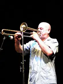 In jazz, some contemporary artists are employing the soprano trombone in their work.[17] Wycliffe Gordon and Christian Scott both use the instrument in solos and on their albums.[18][19] New York musician Steven Bernstein has become well known for playing the "slide trumpet" in his band, Sexmob.[20][21]