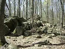 ![]() A ledge containing argillite hornfels visible on the east flank of Sourland Mountain in Hillsborough Twp. | |