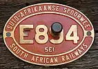 One of the two number plates off no. E894 now serves as a backing plate to a doorknob at a staff club facility which was built from two Class 5E1 shells at Sentrarand Depot in Gauteng.