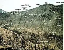 ![]() View showing the West Flank Fireline, looking northeast across the West Drainage | |