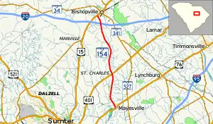 South Carolina Highway 154 (SC 154) is a 16.680-mile-long (26.844 km) state highway in the U.S. state of South Carolina. The highway connects Mayesville and Bishopville.