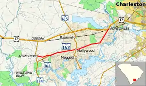 South Carolina Highway 162 (SC 162) is a 13.540-mile (21.791 km) state highway in the U.S. state of South Carolina. The highway connects Adams Run and Rantowles, via Hollywood.