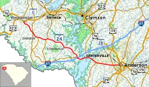 SC 24 begins at an intersection with U.S. Route 76 (US 76) and US 123 (East Main Street) in Westminster, within Oconee County, where the roadway continues as Oak Street. It travels to the southwest and immediately curves to the southeast before leaving the city limits. The highway passes by Pleasant Hill Cemetery and travels through rural areas of the county. Then, it has an intersection with SC 11. The highway continues traveling through rural areas of the county and has an intersection with SC 182 in Oakway. During a short east-northeast section, there is a very brief concurrency with SC 59. The highway passes by Hays Cemetery. SC 24 enters Anderson County and almost immediately has an interchange with Interstate 85 (I-85) which includes an intersection with SC 243 at its northern terminus. It crosses over part of Lake Hartwell on an unnamed bridge. A short distance later, it begins a concurrency with SC 187 at the Portman Shoals Intersection. The two highways cross over another part of the lake on the Calvin Wesley Belcher Bridge. It then enters West Gate, where SC 187 leaves the concurrency. SC 24 travels along the southern city limits of Centerville and passes just north of Anderson Regional Airport. In West Anderson, the highway passes Lakeside Middle School and intersects SC 28. About one mile (1.6 km) later, it enters the city limits of Anderson. Just under 4,000 feet (1,200 m) later, it meets its eastern terminus, an intersection with US 29 Business (US 29 Bus.)/US 76/US 178/SC 28 Bus./SC 81 (Murray Avenue).[3][4]