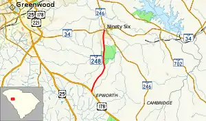 South Carolina Highway 248 (SC 248) is a 6.170-mile (9.930 km) primary state highway in the U.S. state of South Carolina. It serves as main access to the Ninety Six National Historic Site.