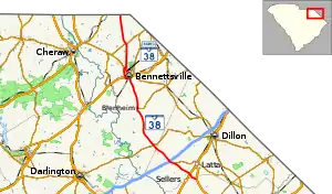 South Carolina Highway 38 Business (SC 38 Bus.) is a 2.865-mile (4.611 km) business route of SC 38 in Bennettsville. It begins at the intersection with U.S. Route 15 (US 15), US 401, SC 9, and SC 38 south of town. The route begins running concurrent with SC 9 heading north along Broad Street. In front of the Marlboro County Courthouse, both SC 9 and SC 38 Bus. make a left along Main Street until reaching the southern terminus of Cheraw Street. Where Cheraw Street and Hamlet Highway merge, both SC 9 and SC 38 Bus. separate. SC 38 Bus. continues on Hamlet Highway heading north. The business route then reaches its northern terminus at a roundabout with its parent route SC 38.[11]