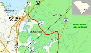 SC 402 is a two-lane rural road that begins at U.S. Route 52 (US 52) and U.S. Route 17 Alternate (US 17 Alt.) near Moncks Corner; per the South Carolina Department of Transportation, SC 402 ends at the pair of U.S. Highways though signage on US 52/US 17 Alt direct travelers "to" SC 402.[1][2] From there, it goes east, through Cordesville and by the Huger Recreational Area. At Huger, it ends at SC 41. Because it traverses mostly in or along Francis Marion National Forest, majority of the route is forested.[2]