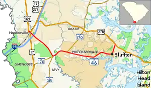 South Carolina Highway 46 (SC 46) is a 17.330-mile-long (27.890 km) state highway in Jasper and Beaufort counties in the Lowcountry region of South Carolina. It connects the rapidly growing communities of Hardeeville and Bluffton and serves as a parallel route to U.S. Route 278 (US 278).