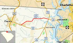 South Carolina Highway 557 (SC 557) is a 6.710-mile (10.799 km) primary state highway in the U.S. state of South Carolina. It serves as a connector route between Clover and Lake Wylie.