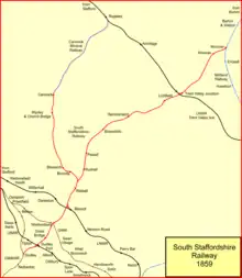 At the same time, another company, the Trent Valley, Midlands and Grand Junction Railway was authorised.[11][12] It was to make a line from Walsall northwards through Lichfield to join the Midland Railway main line (heading towards Burton-on-Trent) at Wichnor. It too was authorised on 3 August 1846, with capital of £420,000. The two companies had been in discussion and saw there were advantages in combining, and this was allowed for in their respective Acts. Final agreement for this was accomplished on 6 October, ratified by an Act of 9 July 1847. The 1847 Act also confirmed a change of name for the combined company, which was to be called the South Staffordshire Railway; the combined share capital was fixed at £945,000; in addition the Act granted running powers over the Midland Railway from Wichnor Junction to Burton.[8][13]