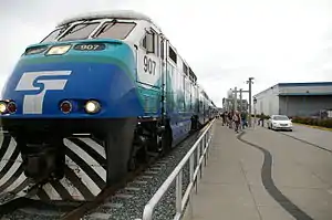 South Tacoma station is served by eight daily round-trips on the Sounder S Line, which travel north to King Street Station in Downtown Seattle and south to Lakewood station on weekdays.[27] Sounder trains travel from South Tacoma to Seattle in approximately 71 minutes.[27] The station is indirectly served by Pierce Transit route 3, which travels primarily on South Tacoma Way between Lakewood Towne Center, Tacoma Mall, and Downtown Tacoma.[28][29] Pierce Transit formerly served South Tacoma station with several routes, including a local bus on South 56th Street that was removed in a 2017 restructure.[30][31] The agency also experimented with a custom express bus from the station to University Place and Olympia that debuted in late 2013, but the program was eliminated in 2014 after a spell of low ridership.[32][33]