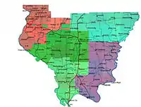 ![]() Counties in red are usually or always included in southern Illinois, while those in pink are sometimes included. | |