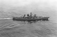 Marshal Voroshilov was relocated to Baltiysk in preparation for its voyage to the Pacific Fleet at Vladivostok after the completion of sea trials in the Baltic during late 1973. While passing through the English Channel, it was shadowed by Royal Navy ships and extensively photographed; the first time a Kresta II-class cruiser had been spotted in Western waters.[14] During the voyage, it visited Port Louis, Mauritius with the tanker Grozny between 2 and 8 March 1974, then Malabo, Equatorial Guinea and Berbera, Somalia between 3 and 17 April.[13] Following the ship's arrival in the Far East, it was assigned to the 201st Anti-Submarine Warfare Brigade of the fleet's 10th Operational Squadron on 11 June, based at Zolotoy Rog on the Sea of Japan. She operated in the Indian Ocean in 1975 and 1976 and was under routine repair at the Dalzavod shipyard in Vladivostok between 30 March and 25 December 1977. During the winter of 1977–1978, the cruiser participated in a rescue operation for three Riga-class frigates of the Sakhalin Flotilla during severe storms in the northern Sea of Japan, which damaged the stern Shtorm launcher and forward Volga navigational radar.[15] With sister Kresta II-class cruiser Admiral Oktyabrsky, destroyer Sposobny, frigate Razyashchiy, and the missile cruiser Vladivostok, she was involved in Pacific Fleet maneuvers on 7 April 1978, observed by General Secretary of the Communist Party of the Soviet Union Leonid Brezhnev and Defense Minister Dmitry Ustinov from the cruiser Admiral Senyavin.[16]