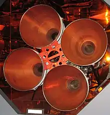 The ability to launch satellites came from the Soviet intercontinental ballistic missile (ICBM) arsenal, using the RD-107 engine for the Vostok launch vehicle. The first Vostok version had 1 core engine and 4 strap-on stage engines. The engines were all vectored thrust capable. The original Vostok was fueled by liquid oxygen and kerosene. There were a total of 20 engines, each capable of contributing 55,000 pounds-force (240 kN) of thrust.[89] The Vostok engine was the first true Soviet design. The technical name was the RD-107 and later the RD-108. These engines had two thrust chambers. They were originally mono-propellant-burning using hydrogen peroxide fuel. This family of engines were utilized not just on the Vostok, but also on the Voskhod, Molniya, and Soyuz launch vehicles.[23]