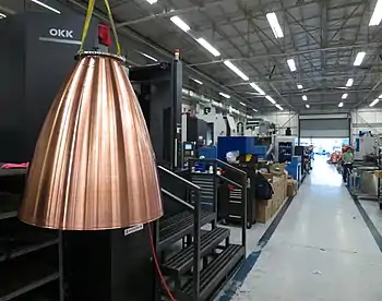 Initial component-level testing of Raptor technology began in May 2014, with an injector element test.[16][19] The first complete Raptor development engine, approximately one-third the size of the full-scale engines planned for the use on various parts of the Starship, with approximately 1,000 kN (220,000 lbf) thrust, began testing on a ground test stand in September 2016. The test nozzle has an expansion ratio of only 150, in order to eliminate flow separation problems while tested in Earth's atmosphere.[20]