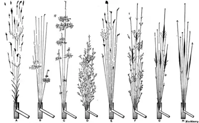 Wrought iron sparks flow out in straight lines. The tails of the sparks widen out near the end, similar to a leaf.[1][5]