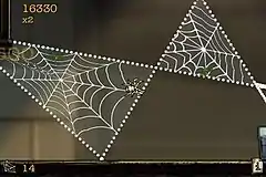 Each level represents a room or area in Bryce Manor and is viewed in a side-scrolling 2D display. Using the touchscreen, the player controls the movement of the spider. Pressing on the right or left side of the screen will make the spider walk in that direction. Swiping in any direction will make the spider jump.[7] To have the spider spin a web, the player must first tap on the screen, and then jump from one surface to another. If the distance between the two surfaces is too great, the web will break.[8] To capture insects, the player must create a triangle of web strands.[9]