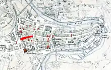 Shortly before 1228, the Holy Ghost hospital and abbey were founded outside the city walls of Bern. While the hospital name changed to Oberer Spital (Upper Hospital) in 1307, when the Niedern Spital (Lower Hospital) was founded in what would later become Gerechtigkeitsgasse 2–10, the abbey and chapel retained the original name.[1] As the city expanded it began to surround the hospital and abbey. Then, in the third expansion of the city from 1344 to 1346, the old Bümpliz road, which ran by the abbey, became part of the main road through Bern. In 1344 it was known as nüwe stat zem heiligen Geist for the abbey's name. However, by 1359 it was known as Spitalgasse after the Oberer Spital. Spitalgasse was an extension of the old Roman road from the east gate of Aventicum to Bümpliz[2] In 1715 the Oberer and Niedern Spital merged into the Grossen Spital (Grand Hospital). The buildings on Spitalgasse were demolished in 1726/31 after the new Burgerspital was built.