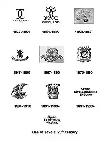 Messrs Spode were succeeded in the same business in c. 1833 by Copeland and Garrett, who often used the name Spode in their marks. In particular these are called 'Late Spode' and include productions of the so-called 'Felspar porcelain'. They also produced other kinds of bone china, earthenware, parian, etc. The partnership continued in this form until 1847.[13] After 1847 the business continued until 1970 as W.T. Copeland and sons, and again the term 'Spode' or 'Late Spode' continued in use alongside the name of Copeland. Under the name 'Spode Ltd' the same factories and business were continued after 1970.