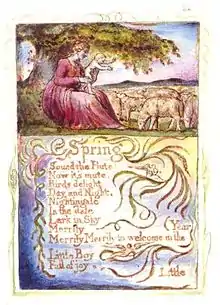 Spring is a lyric poem written and illustrated by William Blake. It was first published in Songs of Innocence (1789) and later in Songs of Innocence and Experience (1794).