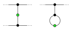 The diagram on the right shows a 2-spot game of normal-play Sprouts. After the fourth move, most of the spots are deadthey have three lines attached to them, so they cannot be used as endpoints for a new line. There are two spots (shown in green) that are still alive, having fewer than three lines attached. However, it is impossible to make another move, because a line from a live spot to itself would make four attachments, and a line from one live spot to the other would cross lines. Therefore, no fifth move is possible, and the first player loses. Live spots at the end of the game are called survivors and play a key role in the analysis of Sprouts.