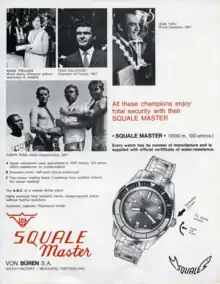 Squale is a French word for shark.[7] The E is silent and it is pronounced "Skwal." In 1946, Charles von Büren created C.Von Büren SA in Neuchâtel, Switzerland. In 1959, after testing the reliability of the watch cases himself on numerous occasion, he registered the Squale trademark. Squale is now based in Chiasso and is in partnership with the Maggi family from Italy.[2]