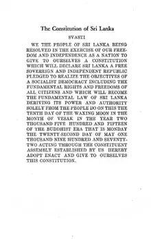 The Sri Lankan Constitution of 1972 was a constitution of Sri Lanka, replaced by the 1978 constitution currently in force. It was Sri Lanka's first republican constitution, and its second since independence in 1948. The constitution changed the country's name from Ceylon to Sri Lanka, and established it as an independent republic.[1][2][3][4][5] The country was officially designated as the "Republic of Sri Lanka," leading to the constitution being known as the 1972 Republican Constitution. The constitution was promulgated on 22 May 1972.[1]