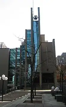The existing church at 117 Bloor Street East is a separate building facing Bloor and is set back into the urban courtyard, St. Andrew's Square. It is adjacent to the office tower at 121 Bloor Street East. A portion of the old church was retained by the city of Toronto and is now located further south on Yonge Street, marking the entrance to McGill Street. Several other United Churches chose the same path during this period, such as College Street United Church and Parkdale United Church.