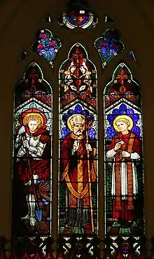 The most prominent is the stained glass triptych window over the high altar depicting three figures. Viewed from left to right from the nave they depict St. Michael, the patron saint of the college, St. Basil, the patron saint of the Basilian Fathers, and St. Charles Borromeo, the patron saint of Father Charles Vincent, the second Rector of the College and Pastor of the Church who was oversaw the renovations the completion of which was marked by the twenty-fifth anniversary of his ordination to the priesthood. The cost of this window was covered by three priest alumni, Fathers Laurent and Rooney of Toronto and Father Heenan of Hamilton. Stained glass was also installed in the windows over the two side altars. These windows were later removed, bricked over and the wall plastered.