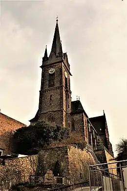 The former church in Lorchhausen, from the 14th century and dedicated to Saint Boniface, was too small and also damaged by several fires,[1] one in 1801, and again in 1872.[2] The parish priest from 1869, Wilhelm Aloys Ohlenschläger, initiated the building of a larger church. The Franco-Prussian War of 1870/71 delayed the project. Due to the narrow situation in the village, the old church could not be replaced. The Pforten vineyard was chosen as the new site. Building began on 21 May 1872 with flattening the site, done by the villagers. In September 1875, the Diocese of Limburg approved the design of a church in Gothic revival style by architect Kontzen from Oestrich.[3] The building was supervised by the Franciscan Paschalis Gratze, who changed the plans, enlarging the interior. The corner stone was set on 19 March 1877. In May 1877, Max Meckel took over,[3] changing the plans again regarding doors, windows, vault, dome and floor. The church was consecrated on 5 June 1879 by Ohlenschläger.[2][3]