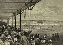 The stadium, which was built in the style of a typical horse race track grandstand, was first used as a baseball field in 1853, with the first game between the New York Knickerbockers and the Washington Club.[2] The site later became part of the development of the then-new community of St. George, Staten Island in 1886, by Erastus Wiman. He established the Staten Island Amusement Company, which owned both the Metropolitans and the grounds. Fans were able to watch games while also watching the construction of the Statue of Liberty a few miles to the north.