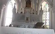 The imposing gate and the flowered garden, which is large welcome visitors who approach the church. The wooden gates with the windows create an atrium that blocked the direct entry into the church and keep the general information of the church on the opposite wooden wall. When visitors enter the church the detail of arches and the ornament columns that has the cross symbol on them attract the attention, which connect the arches each other. Moreover, the colored windows, which are called as stained glass as an architecture term, create an exciting effect on visitors. Also, the high ceiling with the great wooden cross symbol that is above this ceiling and the sculptor of Isa located behind the cross makes the visitors more exciting and feels like they have new and amazing experience. There is a cabin that is used to confess next to narrow spiral stair while there is a sculpture, which are one of the sculptures in some corner and walls in church. Some sculptures placed all around the church that are unhidden although, some of these sculptures are hidden inside the aisle and sides of the transept to emphasize these sculptures. Especially, miniature model of the faced made from plaster is attractive which is located on the wall of apse, behind the marble altar. The wooden seating areas, which are placed near the extended approach, reflect the importance given to religion by architect and the community at that time. In addition, the type of clearstory windows creates a stir on the visitors emotion while they ware walking towards the altar.