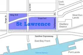 St. Lawrence is a neighbourhood located in downtown Toronto, Ontario, Canada. The area, a former industrial area, is bounded by Yonge, Front, and Parliament Streets, and the Canadian National railway embankment. The Esplanade off Yonge St., lined with restaurants, cafés and hotels runs through the middle of the area. In previous times, the area was sometimes referred to as 'St. Lawrence Ward' or more often today as 'St. Lawrence Market', synonymous with the large retail vendor market which is the neighbourhood's focal point. The area is the site of a large city-sponsored housing project of the 1970s, which revitalized an old brownfields area. The boundaries of the St Lawrence Neighbourhood Association and the St Lawrence Market BIA are somewhat larger than those noted above. Both groups have boundaries that extend from Yonge to Parliament Streets and Queen Street East to the rail corridor.