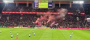 Many new independent supporters' groups were organized in anticipation of the MLS squad's arrival, supporting City 2 throughout their 2022 campaign.[50] These groups include Saint Louis CITY Punks,[51][52] sporting denim vests and Punk rock vibes, as well as the No Nap City Ultras,[53] a supporters' group of parents and their young children, and STL Santos, a supporters’ group for Spanish speakers. 2022 also saw the arrival of a new drum corps and supporters' group, the Fleur de Noise,[54][55] who will take up the role of drumming and leading chants for the supporters.