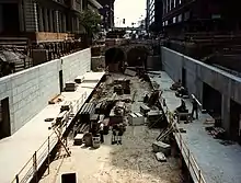 The designer of the Eads Bridge, James B. Eads, worked out the specifications for the tunnel.[1] It would be a cut-and-cover tunnel 4,880 feet (1,490 m) long and 30 feet (9.1 m) below street level. A smokestack with a fan that pulled exhaust from the tunnel was built near St. Charles Street (it has since been demolished).[2] Several problems arose during construction of the bridge and tunnel including design changes, inflated land and labor costs, and renegotiated contracts that escalated construction costs 46% over initial estimates. The tunnel structure was completed by June 24, 1874, and the bridge would open less than a month later on July 4.[3]