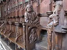 Interrupted by two portals, 66 sculptures[11] in the Memmingen choir stalls depict two cycles: The theological cycle shows sibyls and prophets of the Old Testament under the canopies. They testify to the coming of the Messiah in Christ. Expressive portraits of people from Memmingen's history can be seen on the front sides of the chairs. However, it is not always possible to precisely identify specific persons. Only the objects that the large sculptures hold in their hands provide a reasonably certain assignment. For example, the mayor and his wife or the amman and his wife can be more closely identified. A figure previously interpreted as the abbot of the Antonite abbey can with great probability not be identified as such. However, the persons depicted must have been so well known in Memmingen that a more detailed explanation was not necessary. Also, in the case of one of the sculptures, it can be assumed with relative certainty that it represents the Roman-German king and later emperor Maximilian I, who often stayed in Memmingen, especially at the time the choir stalls were created, and called the city his "cell of rest and sleep." Also because the Antonite abbey preceptor was his house chaplain, this assumption seems to be close to the truth.